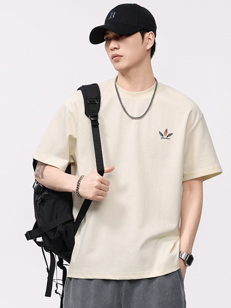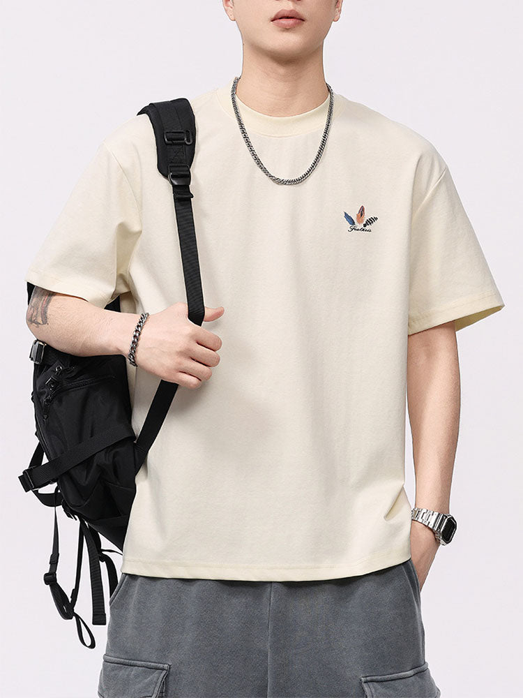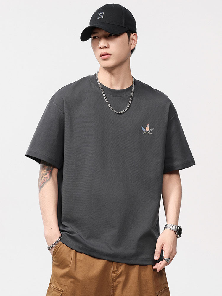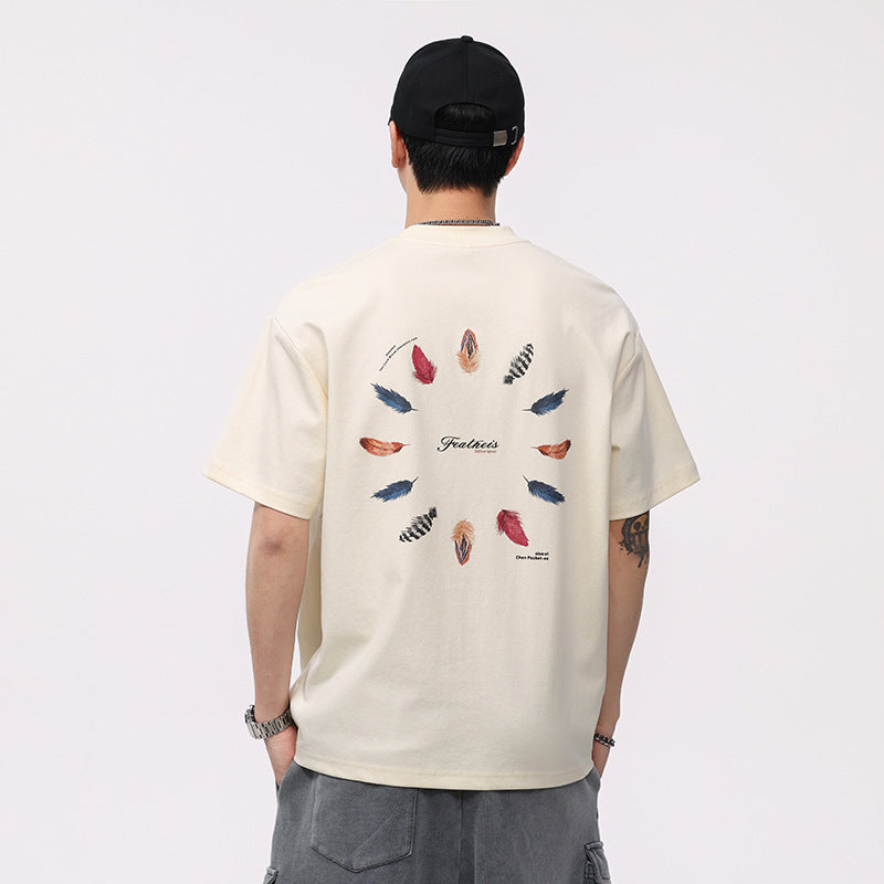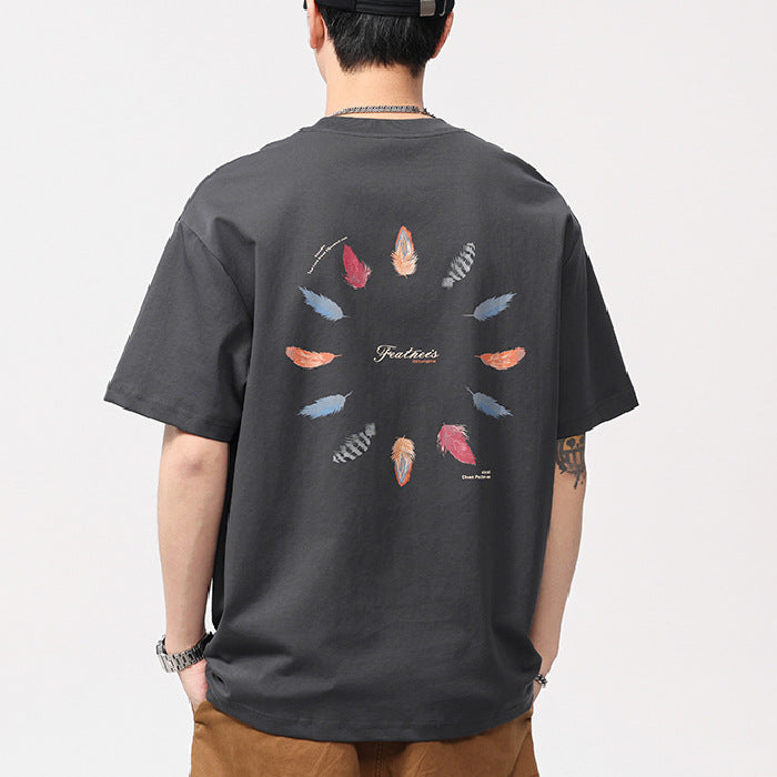 Elevate your casual wardrobe with the Men's Feather - Printed Casual Tee. Crafted from a 71.4% cotton + 23.5% polyester + 5.1% spandex blend, this tee offers a perfect balance of comfort, durability, and stretch. The front features a subtle feather logo, while the back showcases an eye-catching circular feather pattern, adding a touch of artistic flair to your everyday look. Available in beige and dark gray, it's ideal for laid-back outings, weekend hangouts, or simply lounging in style. Pair it with jeans, shorts, or joggers for a relaxed yet fashionable ensemble.