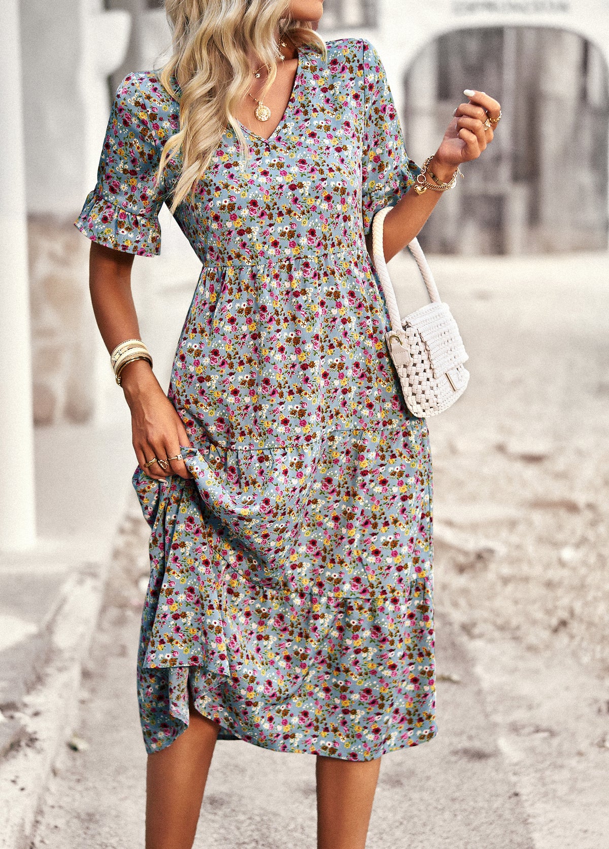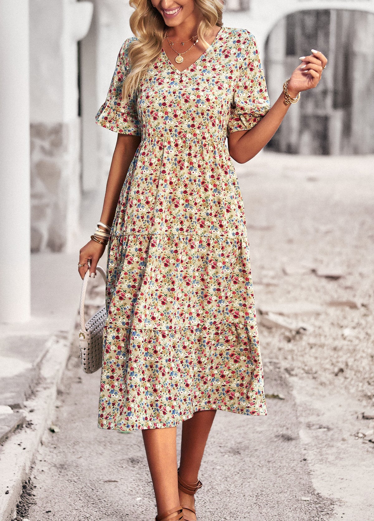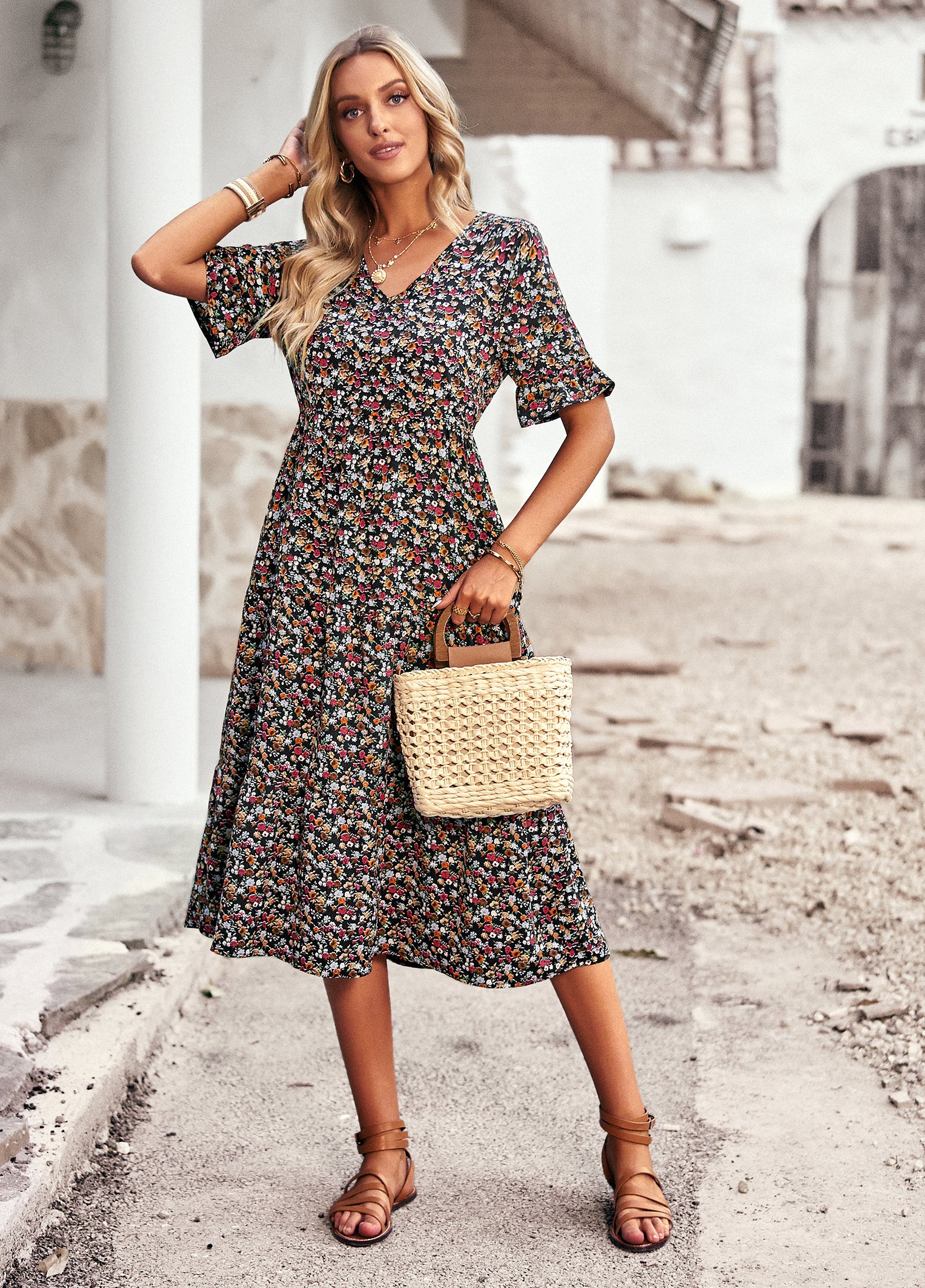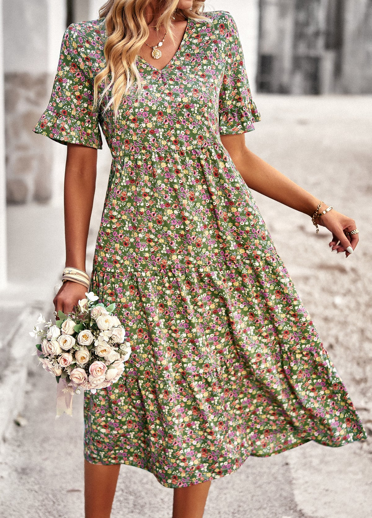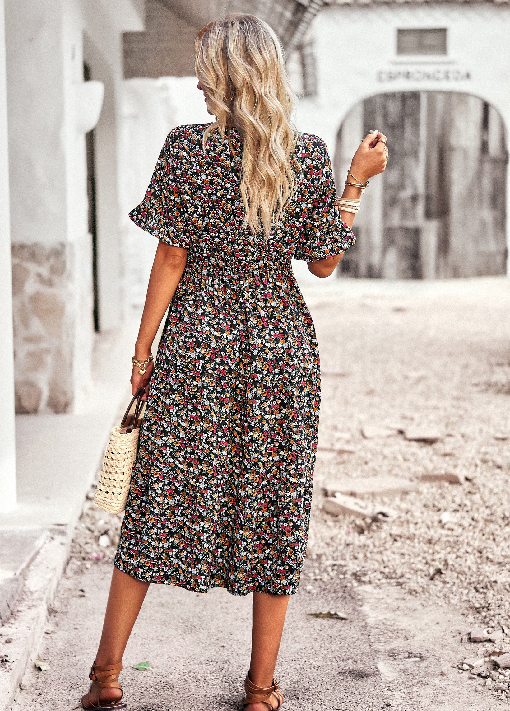 Bring effortless charm to your wardrobe with this Vintage Floral Midi Dress. Crafted from 100% polyester, this dress is lightweight, breathable, and perfect for everyday wear. The all-over ditsy floral print gives it a timeless romantic feel, while the flattering V-neckline, elastic waist, and flutter sleeves enhance its feminine silhouette. Whether you're heading to a weekend market, a casual brunch, or a summer getaway, this dress is your go-to for relaxed elegance.