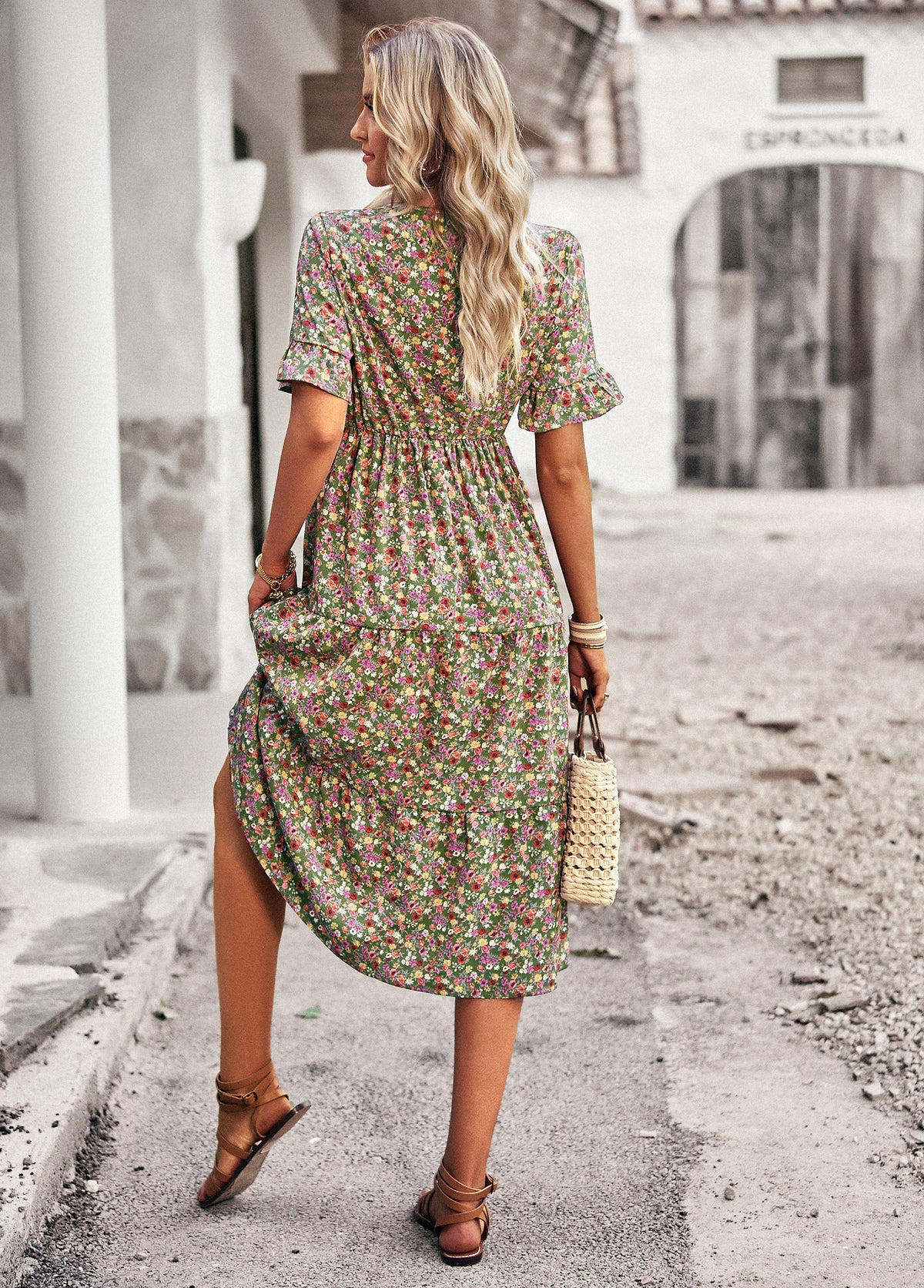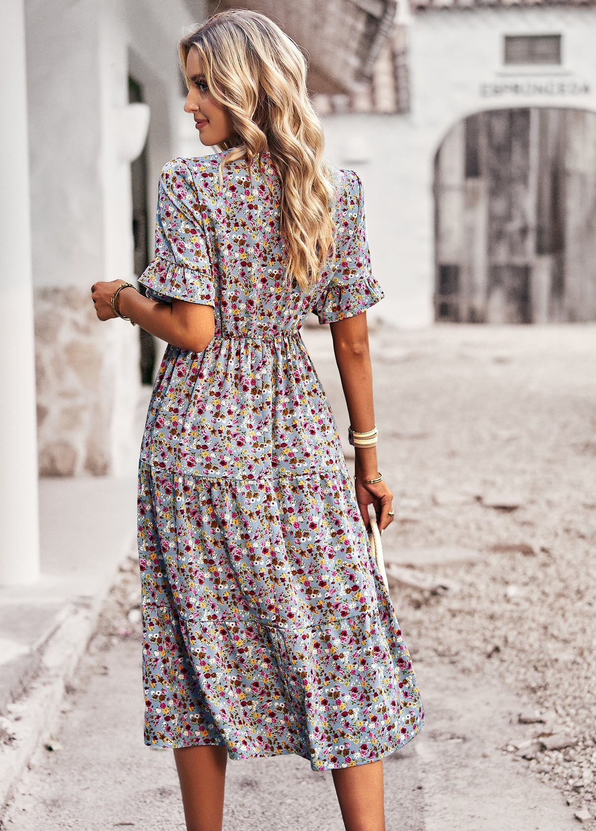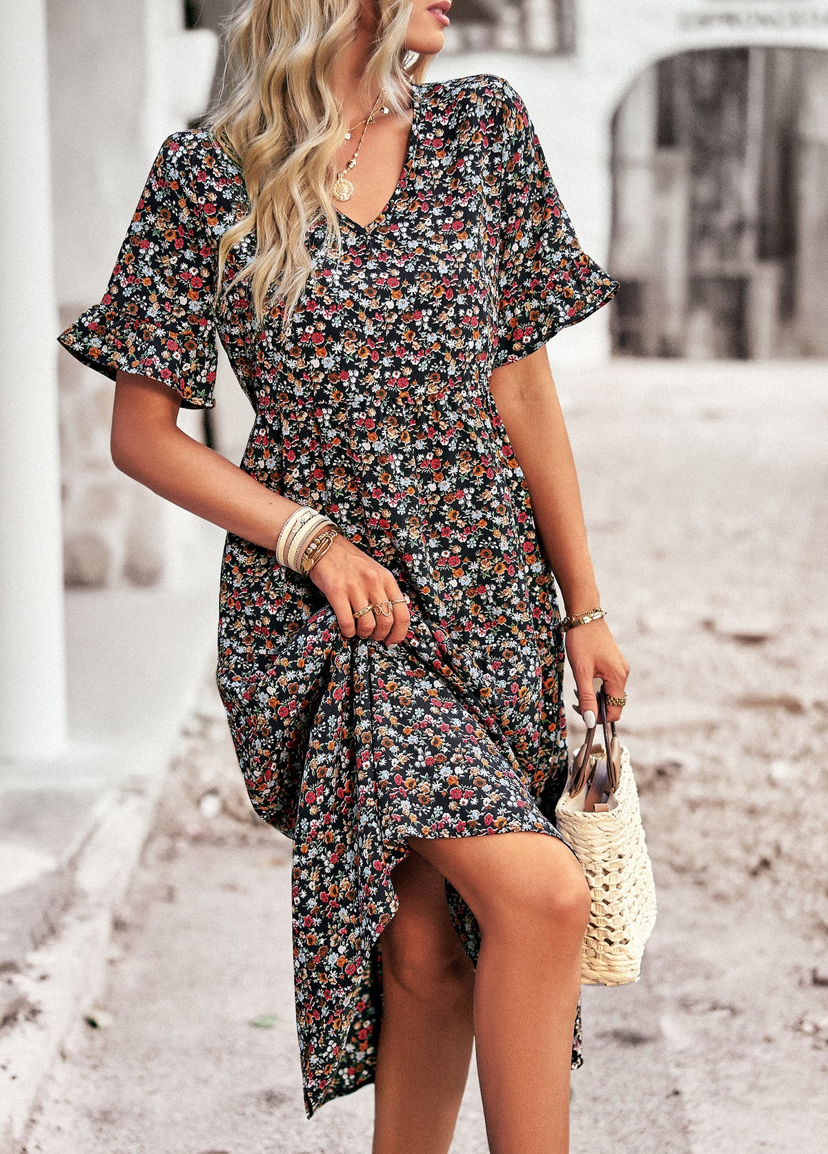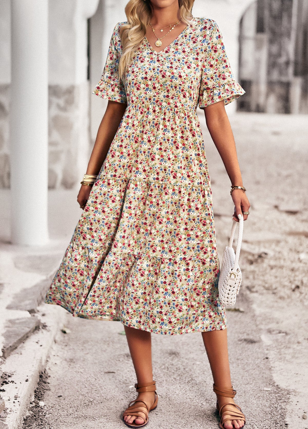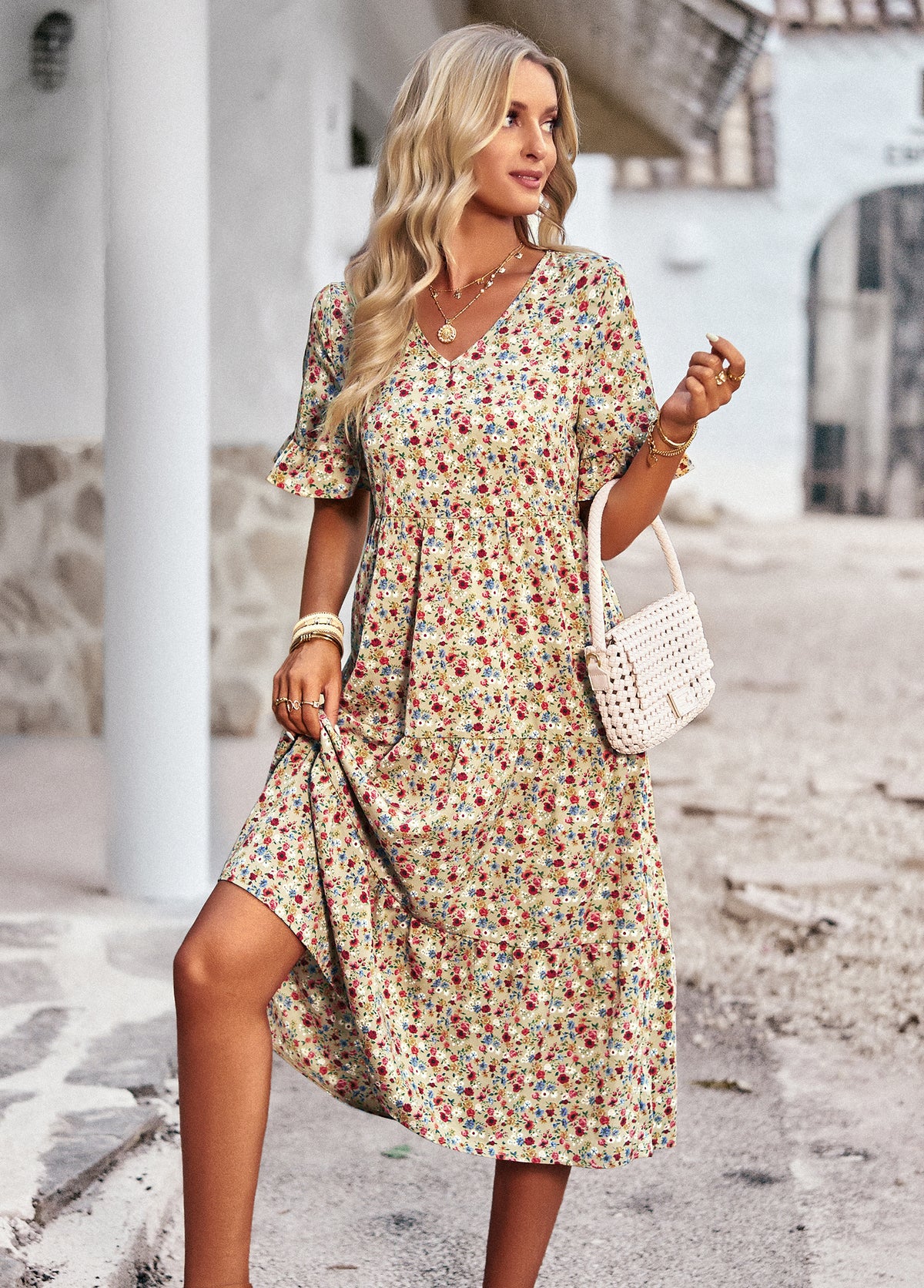 Bring effortless charm to your wardrobe with this Vintage Floral Midi Dress. Crafted from 100% polyester, this dress is lightweight, breathable, and perfect for everyday wear. The all-over ditsy floral print gives it a timeless romantic feel, while the flattering V-neckline, elastic waist, and flutter sleeves enhance its feminine silhouette. Whether you're heading to a weekend market, a casual brunch, or a summer getaway, this dress is your go-to for relaxed elegance.