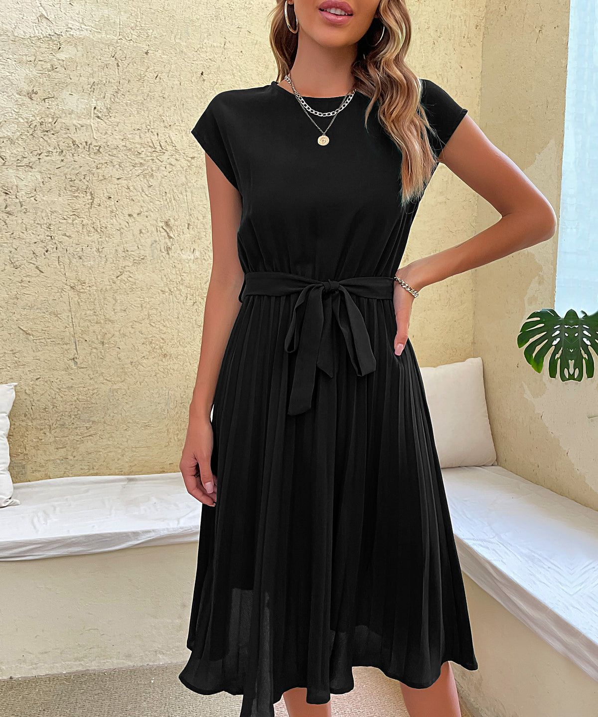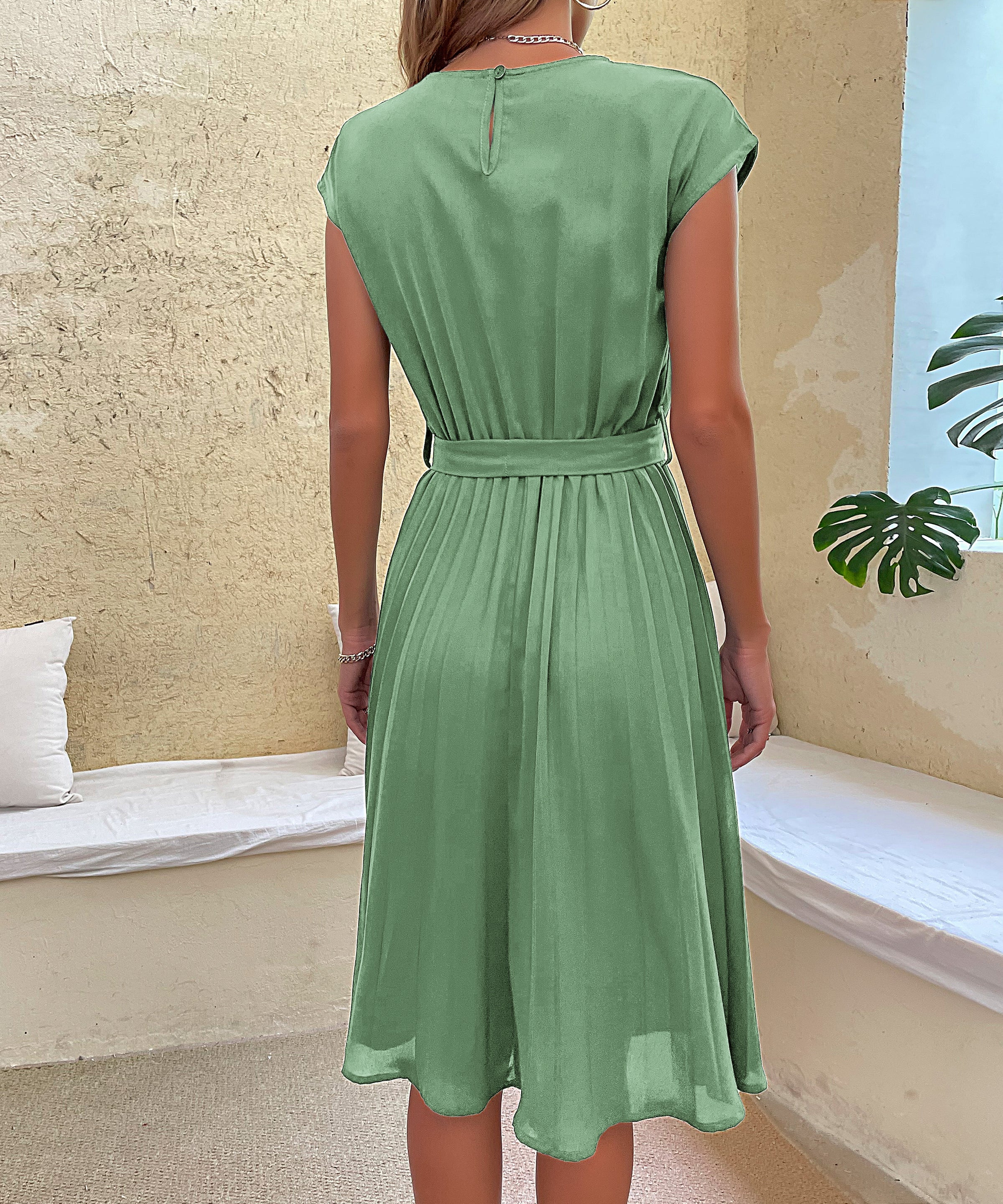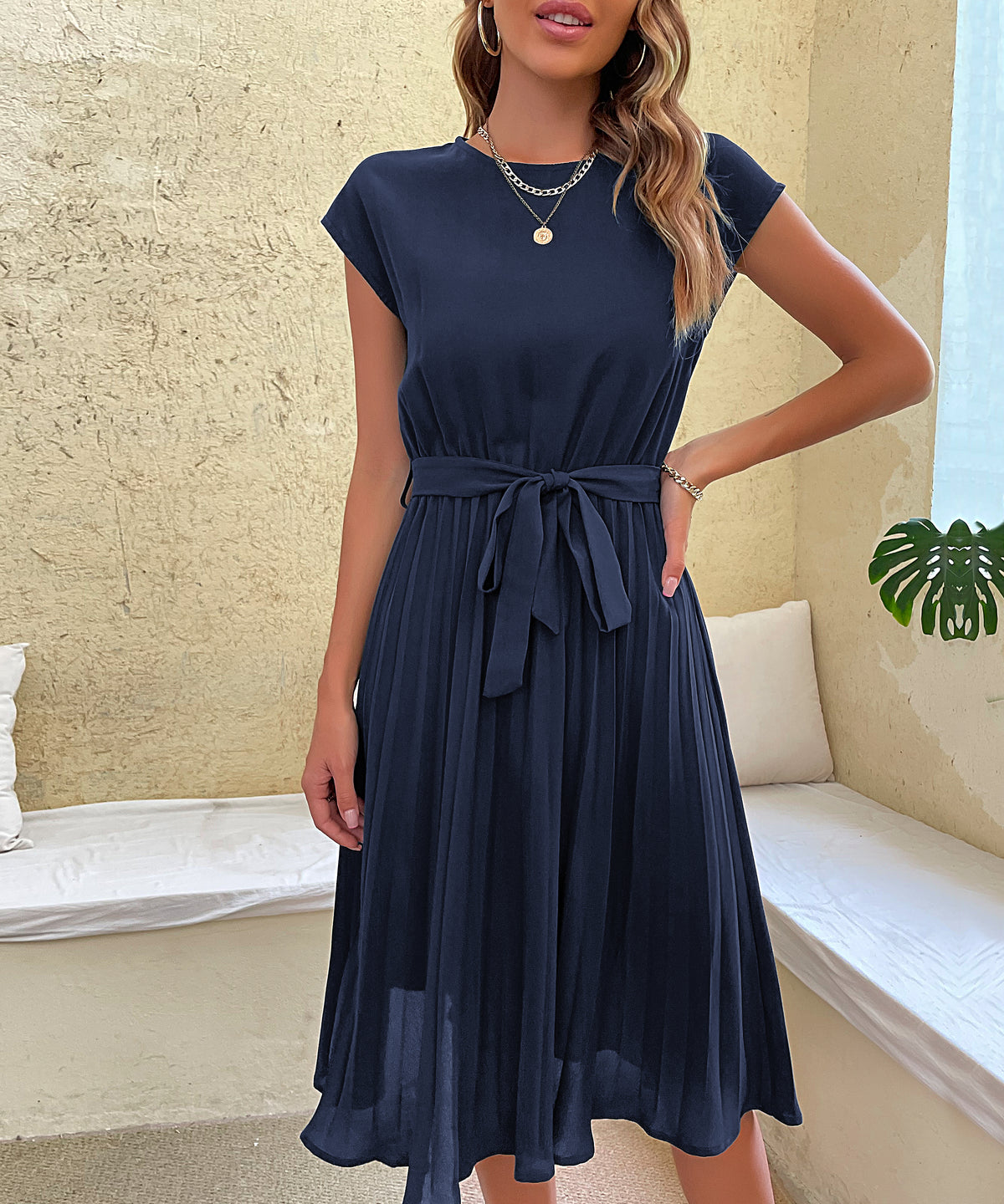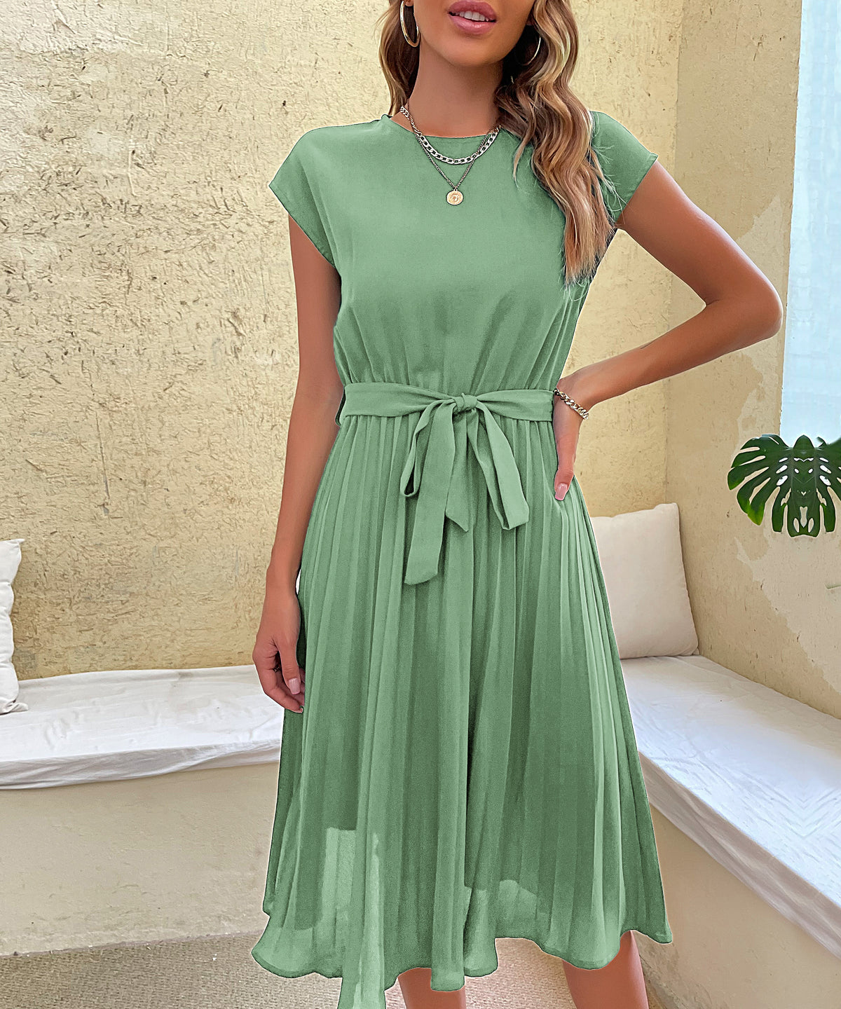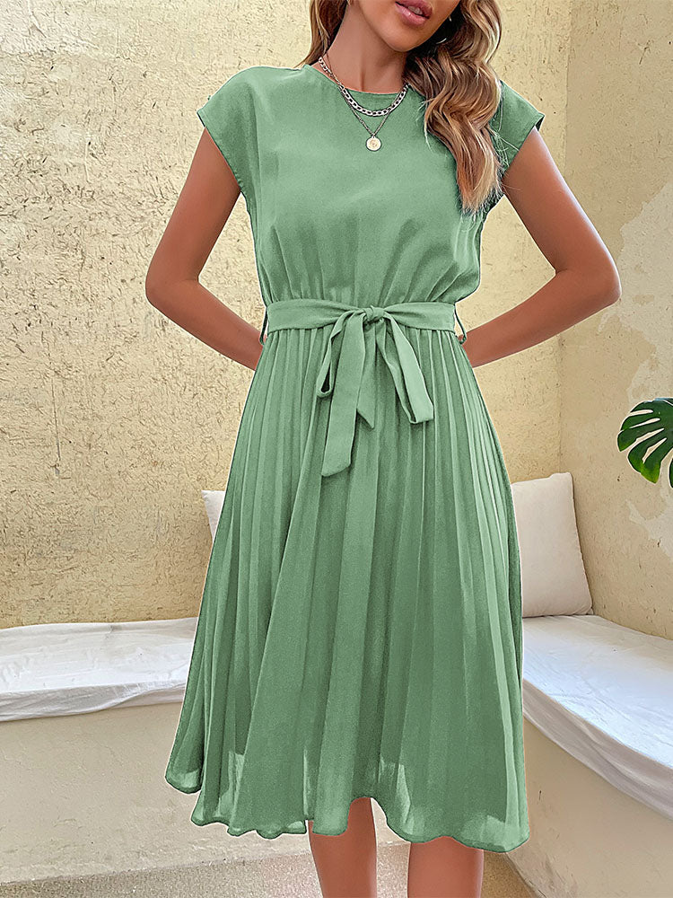 Women's Belted Pleated Midi Dress