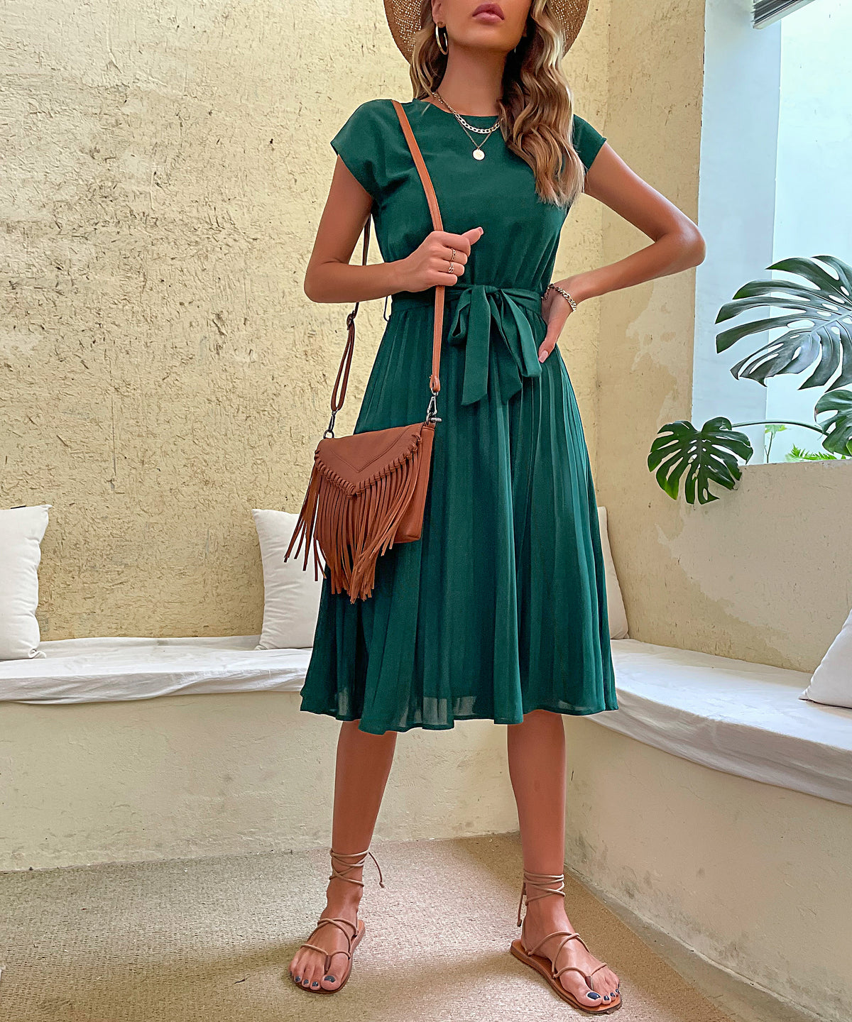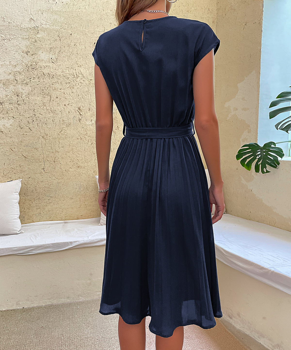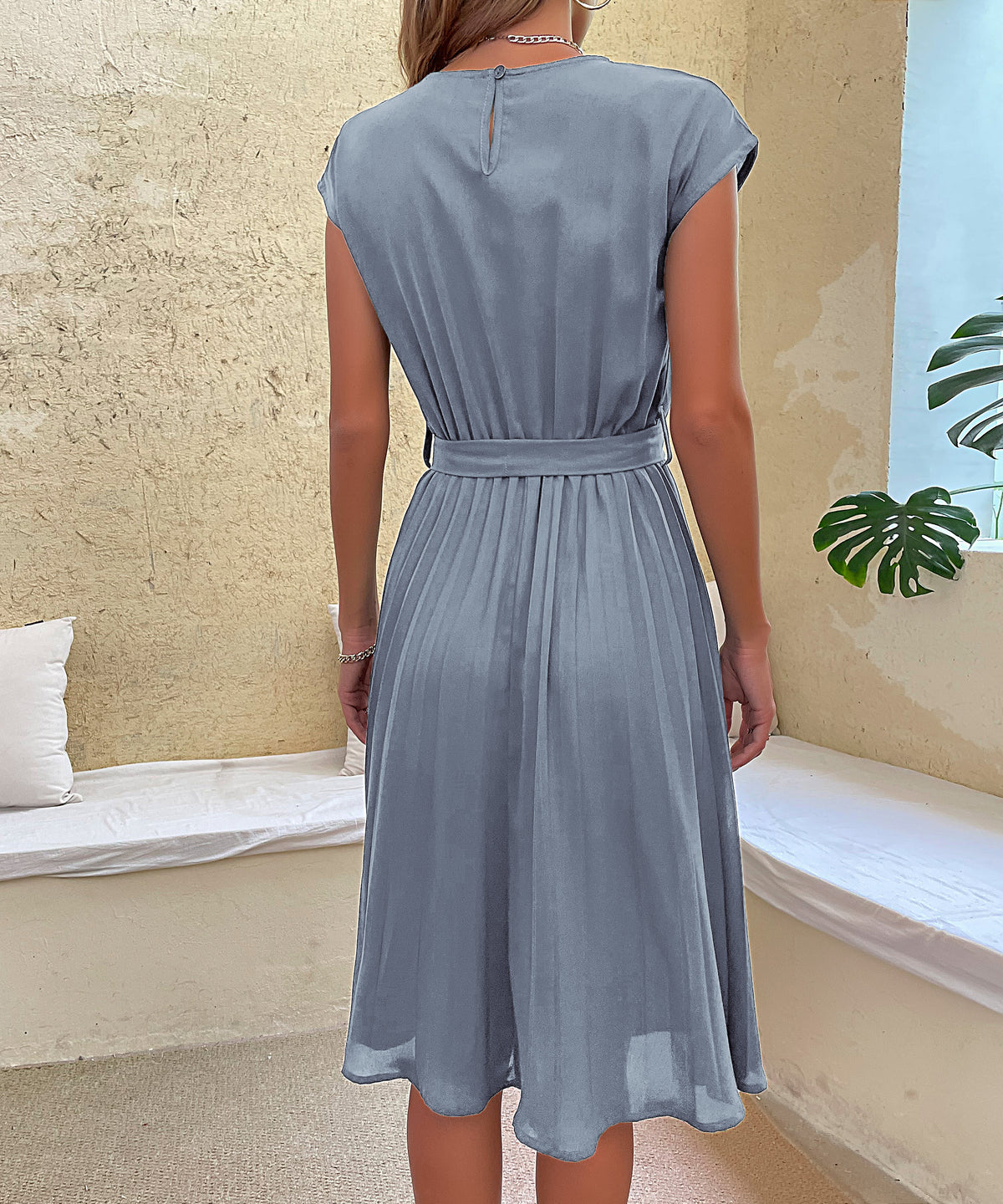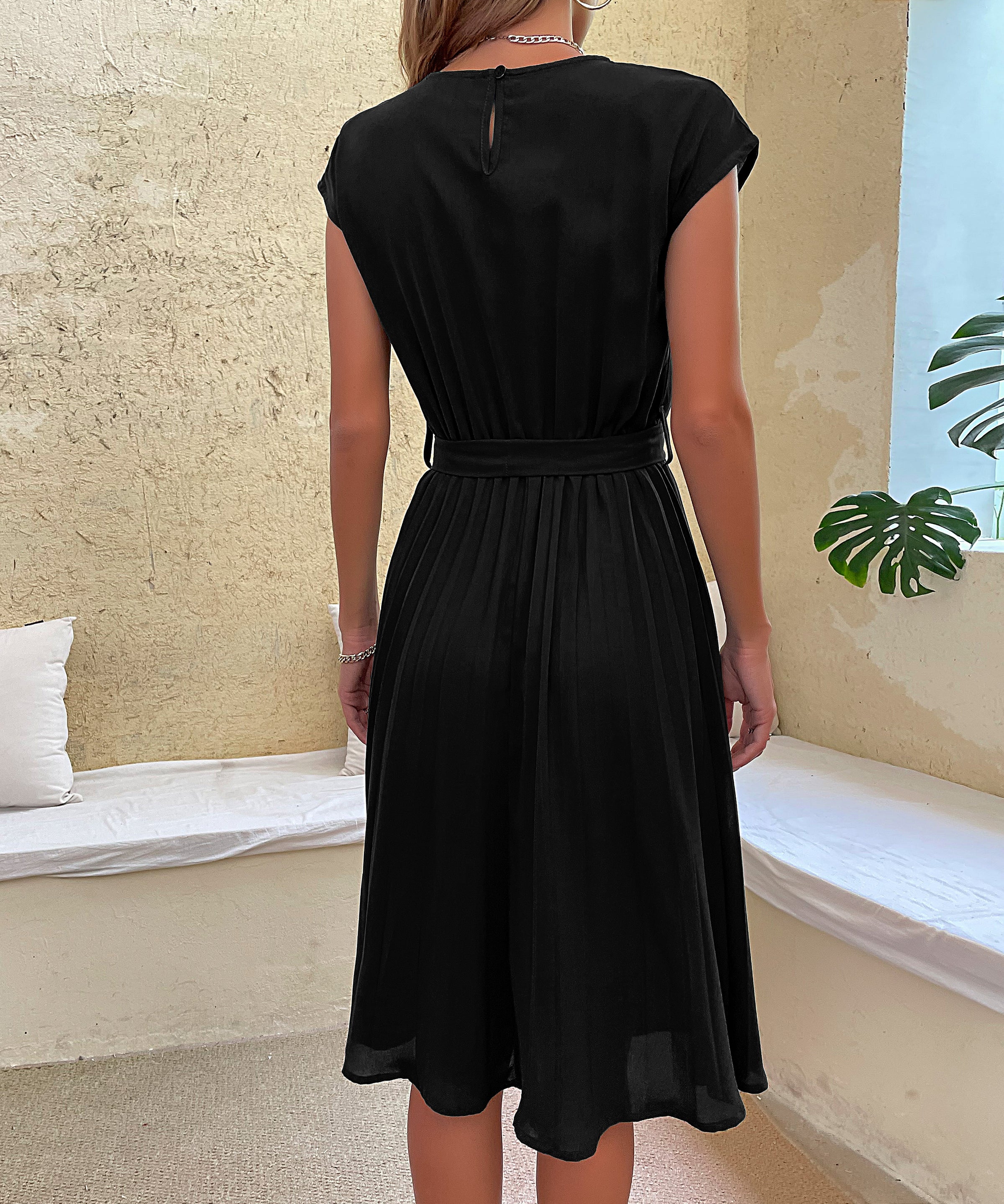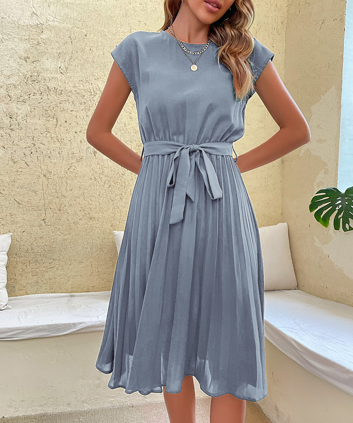 Women's Belted Pleated Midi Dress