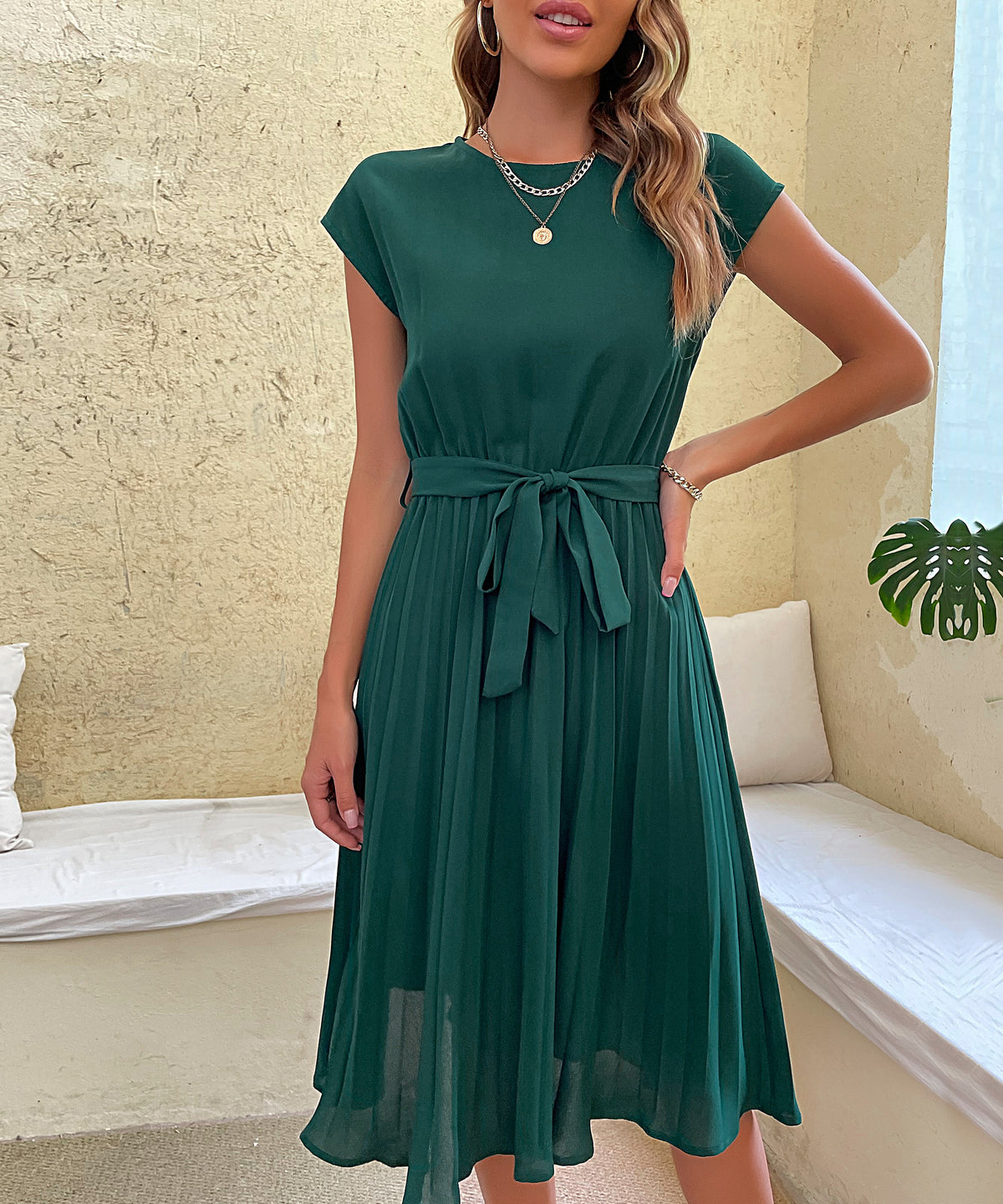 Elevate your wardrobe with the Women's Polyester Belted Pleated Midi Dress. Made from high-quality polyester, this dress combines elegance and comfort. The pleated skirt adds a touch of femininity, while the belted waist creates a flattering silhouette. With short sleeves and a midi length, it's perfect for various occasions, from casual outings to semi-formal events. Available in classic colors like green, navy, gray, and black, it's easy to style and pair with your favorite accessories.